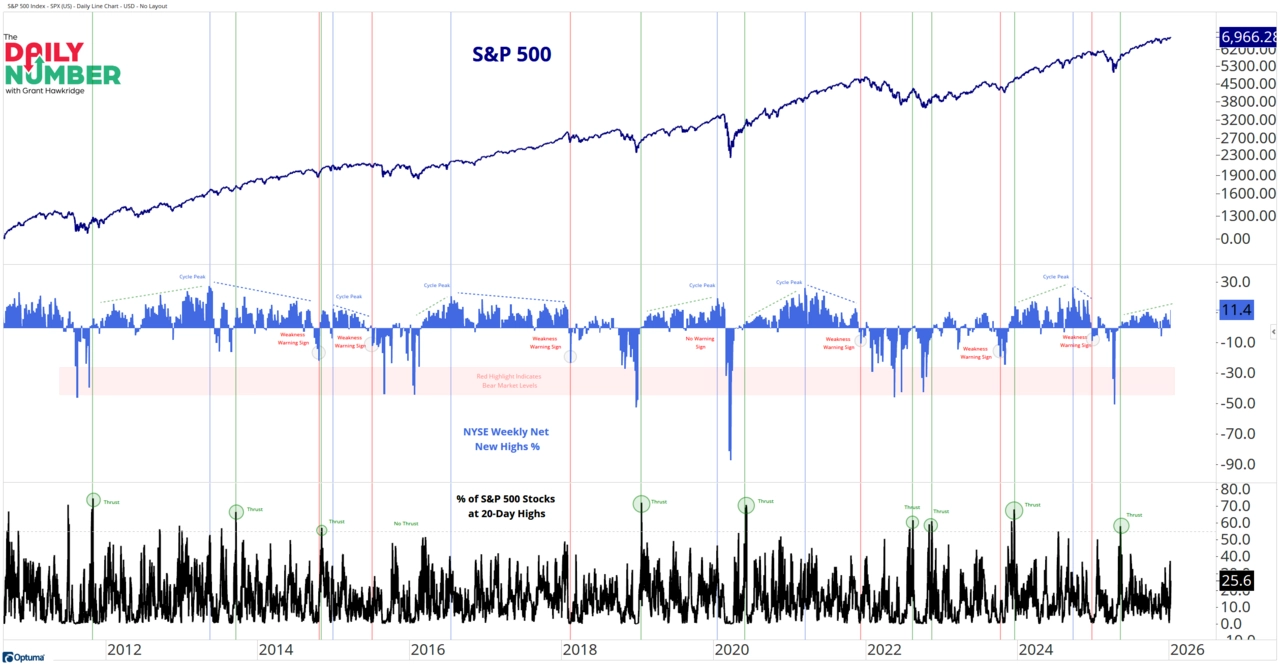 Neznamená to přitom, že by americký trh na tom byl nějak špatně. Indexy v USA posouvají historická maxima, na jejich zhodnocení pro zahraniční investory ale v uplynulém roce výrazně dolehlo oslabování dolaru. Nicméně na burze v New Yorku dosahuje aktuálně ukazatel NYSE Weekly Net New Highs 11,4 %, což znamená nejsilnější takzvanou šíři trhu od roku 2024. A to ukazuje, že růst v USA má poměrně pevný základ.