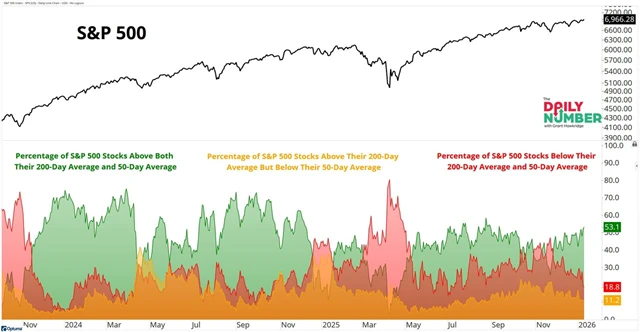 "Více akcií se k růstu přidává, než aby z něj vypadávalo. Hrozící korekce tak jsou rychleji odvráceny, rotace kapitálu probíhá v rámci býčího trendu a peněz v akciích celkově přibývá. Růstový trend tak má stále silnou podporu," říká Grant Hawkridge z All Star Charts. "Přes polovinu akcií z indexu S&P 500 je v silném růstovém trendu."