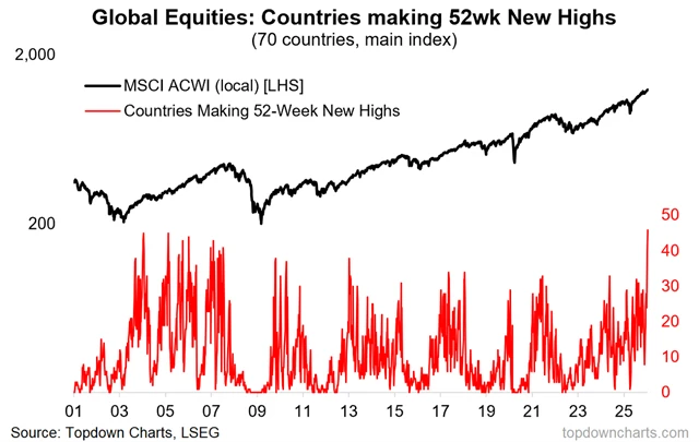 Nejde o překlep, ale o mimořádně silný signál. Rekordní počet národních akciových trhů dosahuje nových maxim. "Ze 70 trhů, které sleduji, je jich aktuálně na rekordu 47," říká Callum Thomas z TOPDOWN CHARTS. Tak vysokému číslu se trhy naposledy přiblížily na začátku tisíciletí během silného globálního býčího trendu, kdy se dařilo komoditám, rozvíjející se trhy procházely zásadní proměnou a globální akcie jasně překonávaly ty americké.