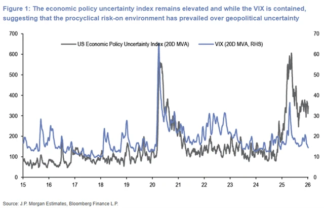 Akciové trhy vstoupily do roku 2026 pod silným náporem nejistot a politického i ekonomického "hluku", který by teoreticky měl stát v cestě růstu cen. Býčí trend ale pokračuje. Investoři museli hned zkraje roku vstřebat dramatické geopolitické události, kontroverzní kroky a výroky amerického prezidenta Trumpa (od zásahů do trhu s bydlením přes omezení dividend a buybacků u zbrojařů, navyšování obranného rozpočtu a snahy uměle stlačit hypotéční sazby až po tlak na zastropování úroků z kreditních karet a na Jeromea Powella) a nejednoznačná data z trhu práce i bezprecedentní kroky ministerstva spravedlnosti. Na Ukrajině umírají civilisté a řeší se, co si Trump napříště dovolí třeba v Grónsku. Nejistota na úrovni politiky je vysoká, volatilita na trzích je ale dále utlumená.