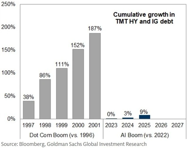 Jestli hledáte rozdíly mezi internetovou bublinou na konci 20. století a současným AI boomem, tady máte jeden. Jde konkrétně o růst dluhu (kvalitní i junk bondy) v odvětví technologií, telekomunikací a médií.
