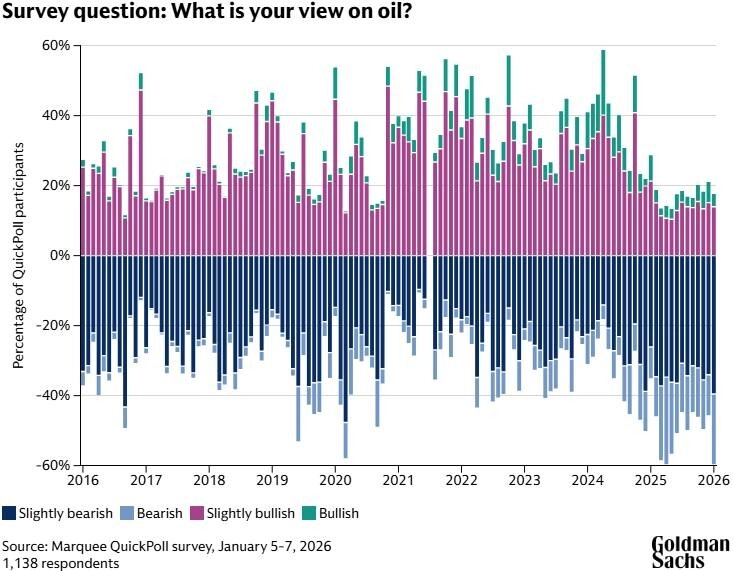 Podle průzkumu mezi klienty Goldman Sachs, který proběhl minulý týden, dosáhl pesimismus investorů ohledně vývoje cen ropy v lednu extrémní úrovně. Za posledních deset let byl tak silný negativní sentiment zaznamenaný pouze loni v dubnu. Celkovou náladu na trzích výrazně ovlivňuje geopolitika, kterou 42 % investorů označilo za jedno z největších rizik (hned po amerických makrodatech se 49 %).