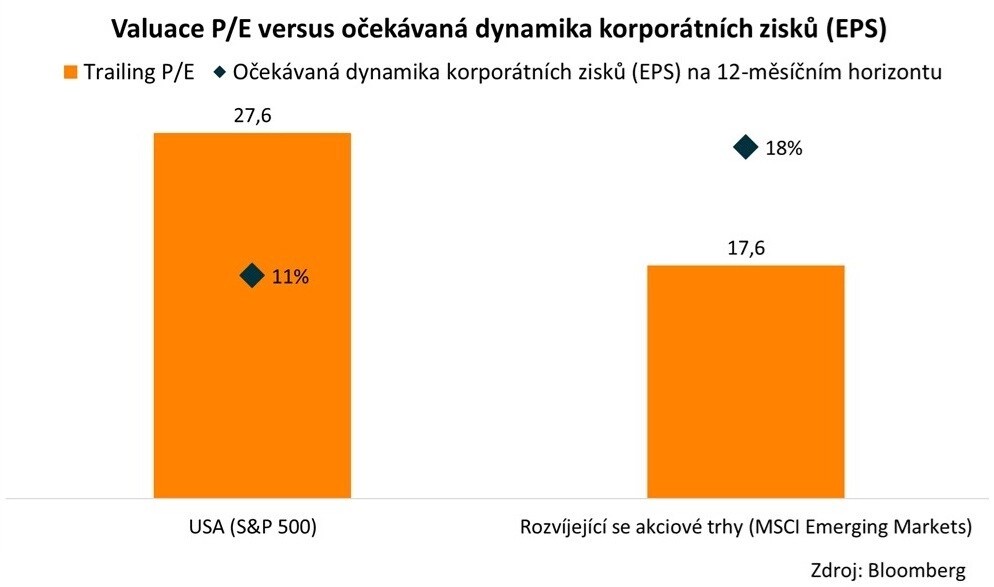 - Očekávaná míra růstu zisků firem (zisk na akcii, EPS) za celý letošní rok na rozvíjejících se trzích je 18 %, v případě amerických akcií "jen" 11 %.