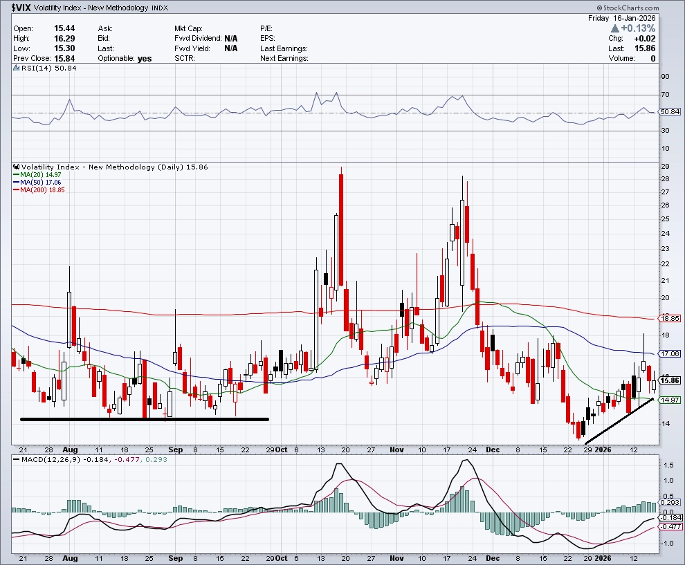 Index volatility VIX nepředvádí nic divokého a během mírných poklesů akciového trhu odpovídajícím způsobem lehce roste. Za týden přidal 9,45 %, posouvá se ale z velice nízkých úrovní. Od Vánoc je ale patrná mírná tendence k růstu volatility, na historickém maximu akciového trhu to ale není překvapení, tendence obchodníků se zajišťovat už byla zmíněna. Varovný by v případě VIX byl až vzestup nad jeho 200denní průměr.