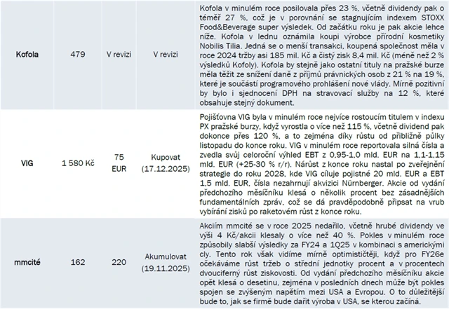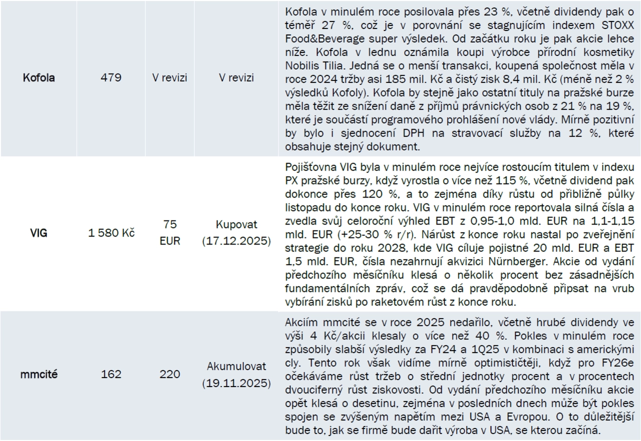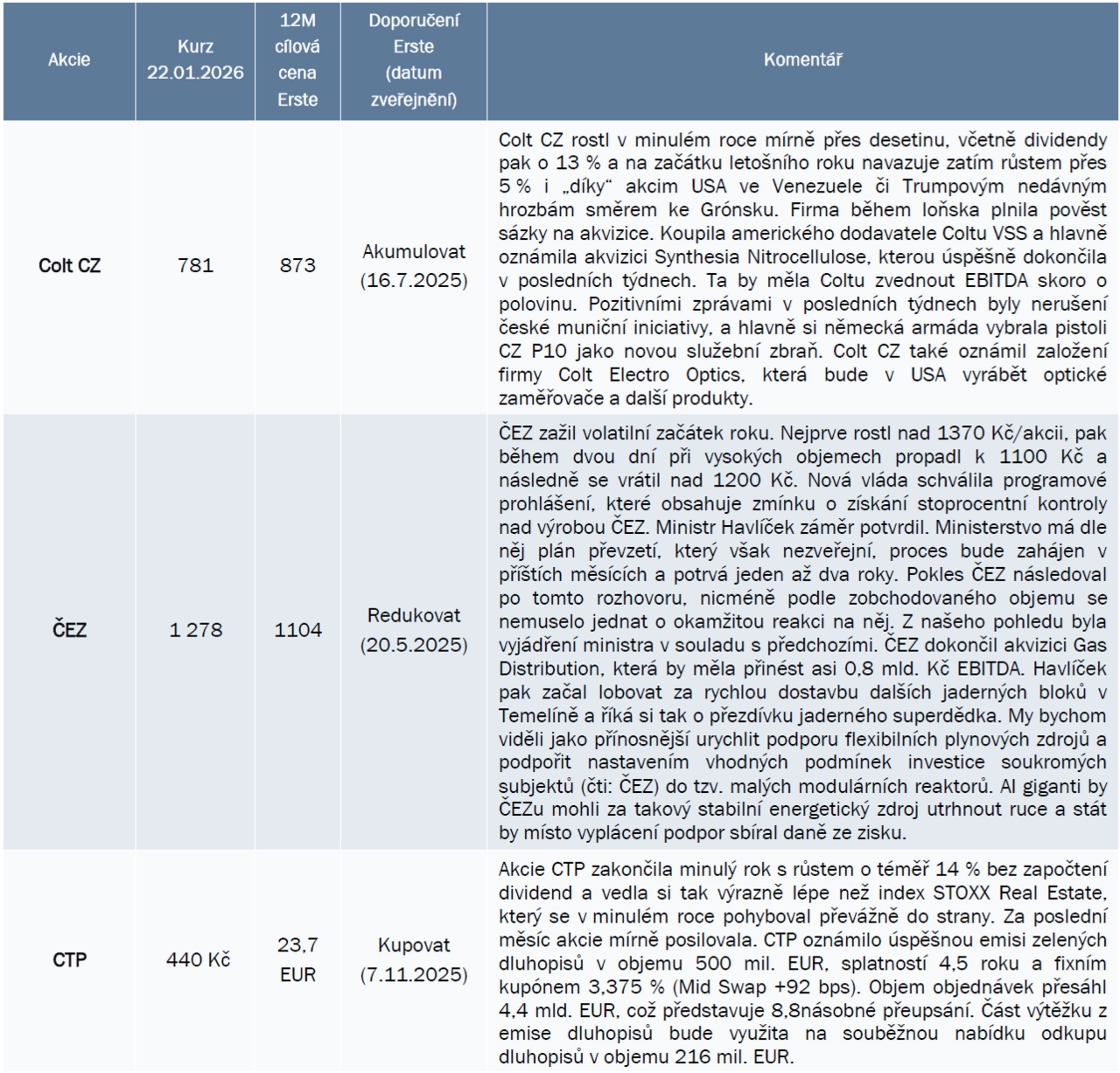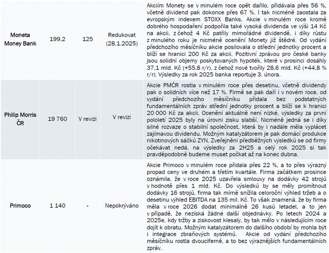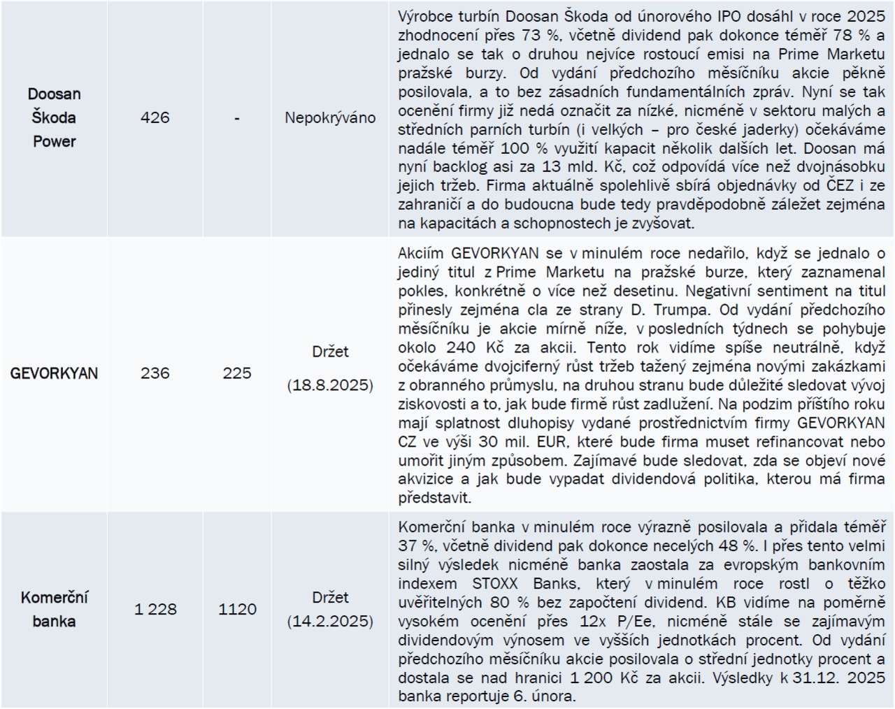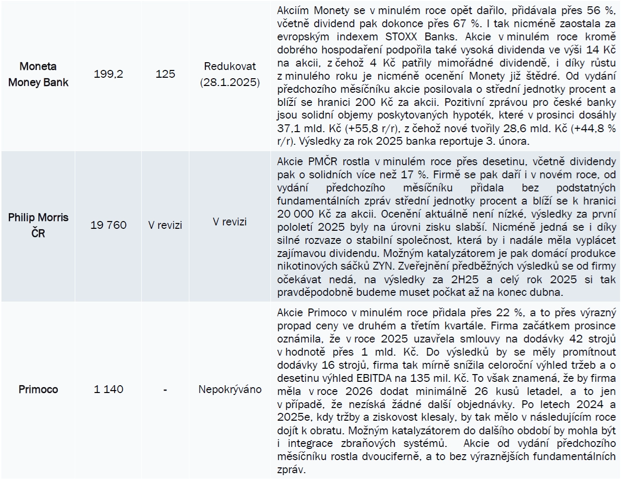 V Praze se v uplynulém měsíci dařilo bankovním titulům, které posilovaly o střední až vyšší jednotky procent. O střední jednotky procent zpevnily také Philip Morris ČR, Colt CZ, Primoco UAV a Doosan Škoda Power. Níže táhly index akcie ČEZ, které mají za sebou velice volatilní období zahrnující prudký dvoudenní propad o zhruba 15 %, ze kterého se následně částečně vzpamatovaly. Zveřejňování výsledků za loňský rok tradičně odstartuje MONETA Money Bank začátkem února, následovat budou Komerční banka a další firmy.