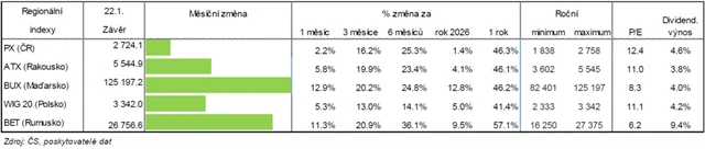 Po mimořádně silném roce 2025, kdy všechny sledované indexy v regionu střední a východní Evropy přidaly desítky procent, se zdá, že se pozitivní sentiment překlopil i do roku letošního. Nejskromněji je na tom zatím pražský PX, o střední jednotky procent rostou rakouský ATX a polský WIG 20. Skoro o desetinu už se zvedl rumunský BET a bezmála 13 % přidává maďarský BUX.