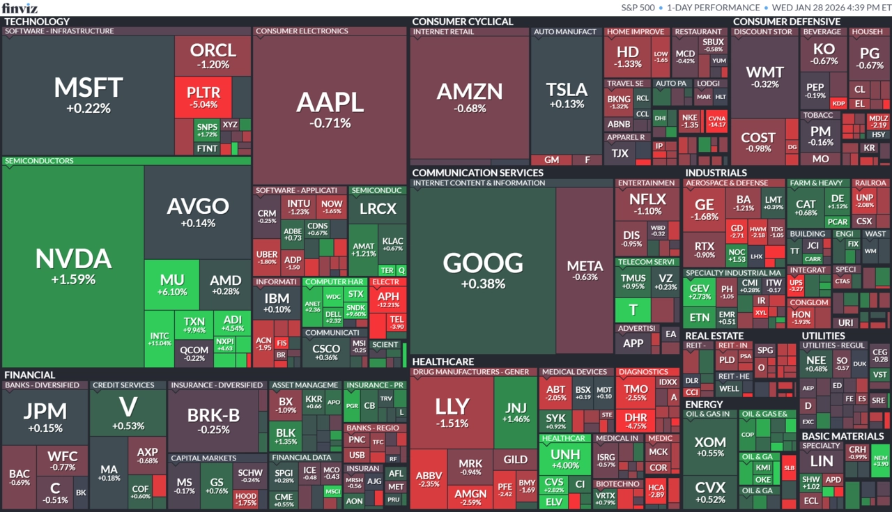 Pozitivní nálada se nepřenesla na celý trh, růst zůstal omezený hlavně na čipové firmy. Investoři vyhlíželi výsledky firem Tesla (-0,10 %, v after-marketu zhruba +3 %), Meta Platforms (-0,63 %, v after-marketu +7 %), Microsoft (+0,22 %, v after-marketu -4 %) nebo IBM (+0,10 %, v after-marketu +8 %), které je oznámily po skončení obchodování, a také Applu, který zveřejňuje kvartální údaje ve čtvrtek.