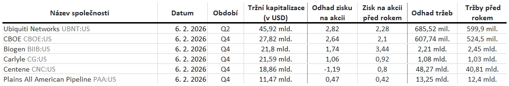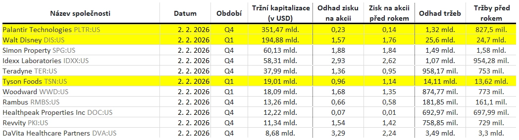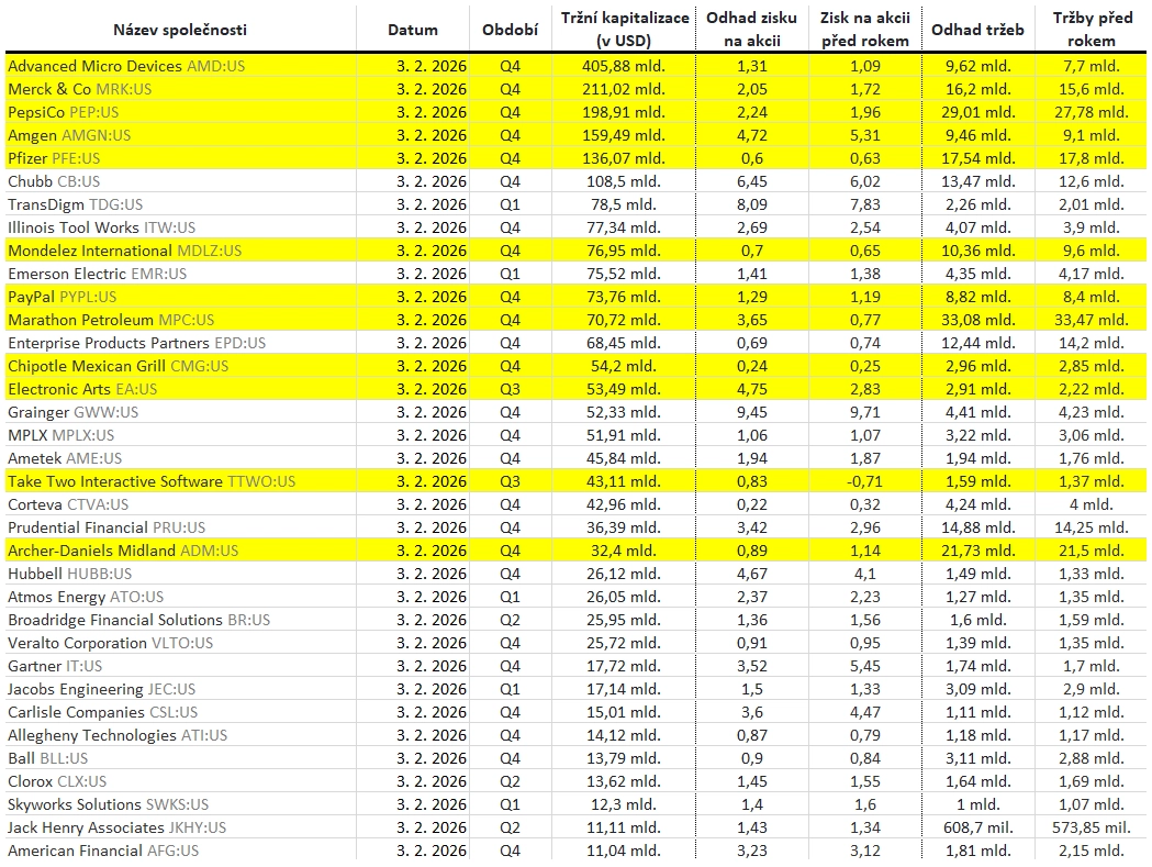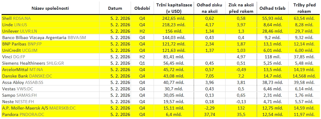 Které firmy představí výsledky hospodaření za uplynulý kvartál v týdnu od 2. února 2026 a jaké zisky v rámci indexů S&P 500 a STOXX Europe 600 očekávají analytici oslovení agenturou LSEG?