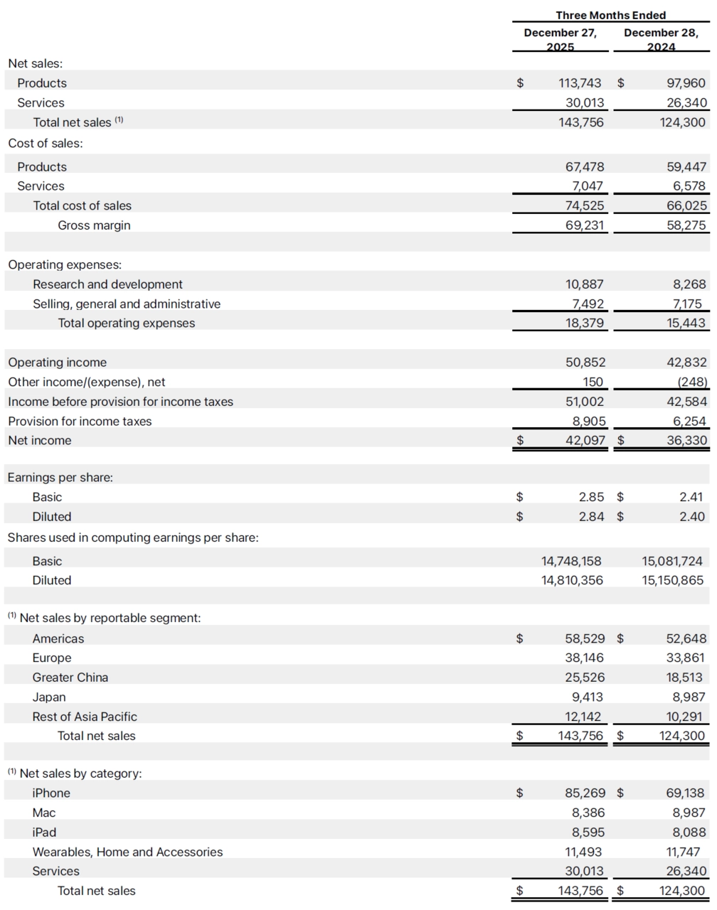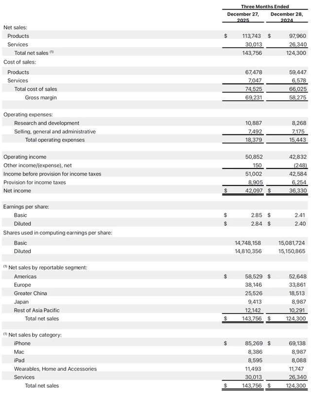 Tržby Applu meziročně vzrostly o 16 % na 143,76 miliardy dolarů a čistý zisk dosáhl 42,10 miliardy dolarů, tedy 2,84 dolaru na akcii. Ve srovnání s loňskem tak firma výrazně zlepšila jak absolutní ziskovost, tak marže, přičemž hrubá marže se zvýšila na 48,2 %, nad odhady analytiků.
