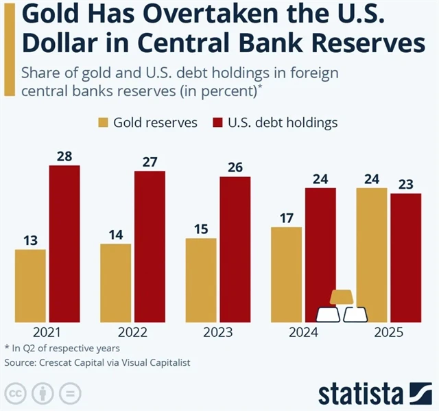 Poprvé od roku 1996 centrální banky mimo USA drží ve svých rezervách více zlata než amerických státních dluhopisů. To představuje historický zlom v globálním řízení devizových rezerv.