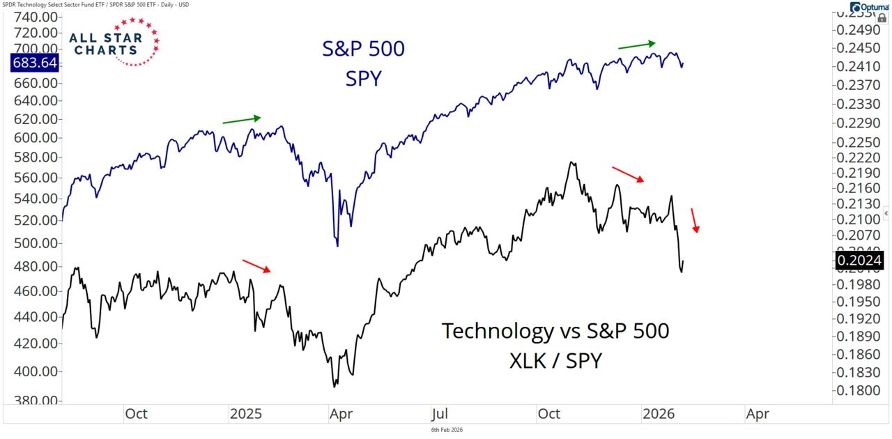 Asi největší riziko je v současnosti v technologickém odvětví. Odklon od růstových titulů je i přes páteční "protipohyb" výrazný, software je pod silným tlakem, spekulativní technologie ztrácejí, znovu se mluví o nejistotě efektivity masivních investic do AI. Masivní propad ceny bitcoinu jen dokresluje ponurý obrázek této oblasti trhu.
