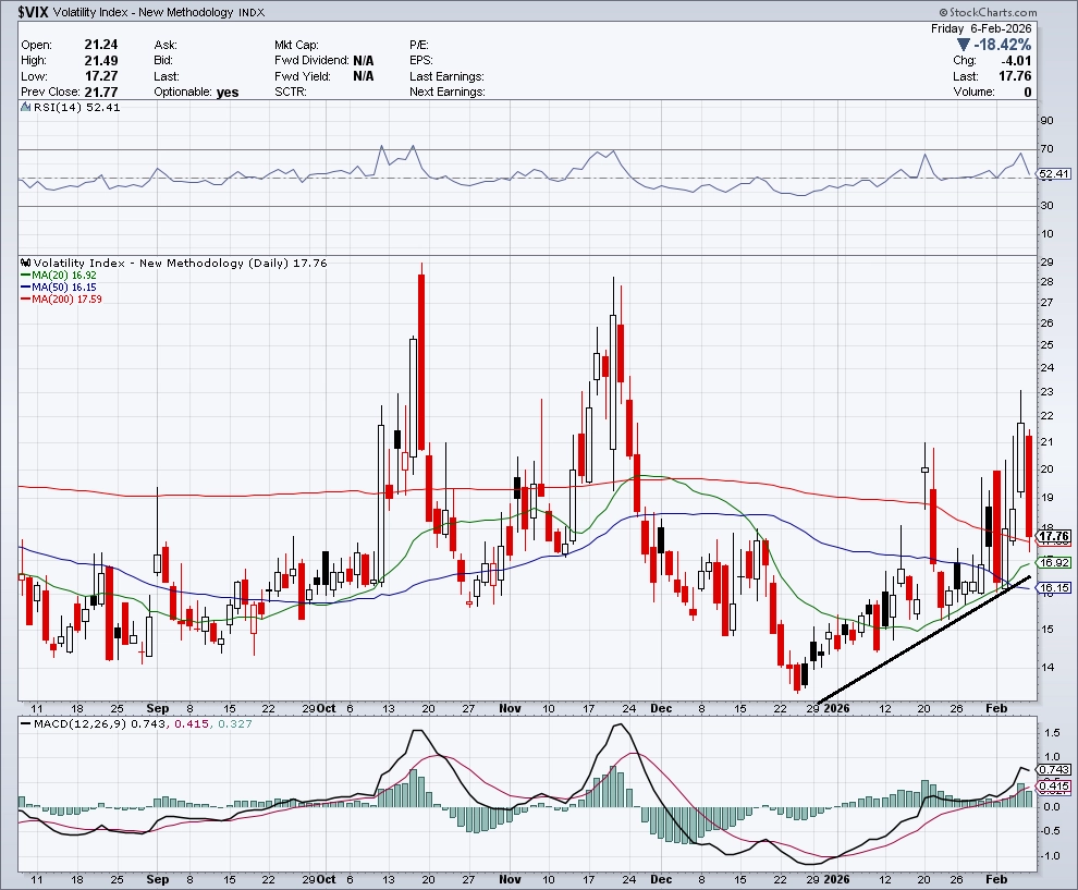 Index volatility VIX v týdnu vystřelil až k 23 bodům, v pátek ale prudce klesl, a tak za týden vzrostl pouze o 1,83 %. Volatilita postupně roste už několik týdnů, po tak rychlém vzestupu a následném propadu "indexu strachu" může mít akciový trh minimálně krátkodobě tendenci spíše dále růst.