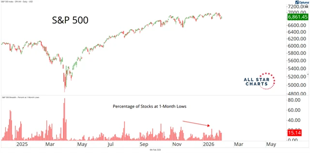 Americký akciový trh je aktuálně znatelně rozdělený. Některé sektory vykazují sílu (defenziva), jiné výrazně slábnou (technologie, v medvědím trendu je subsektor softwaru). Aby ale hrozila skutečná korekce, musela by ztrácet daleko větší část akcií v indexu S&P 500. To se teď neděje, počet firem s akciemi na krátkodobých (měsíčních) minimech nezrychluje. To je celkem pozitivní signál.