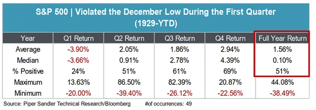 Zásadní je ale až hladina 6 720 bodů, kde byla prosincová minima. Až její proražení by otevřelo prostor pro výrazně medvědí scénář a propad trhu. K prosincovým minimům se ostatně váže i jeden ze sezónních "vzorců", kdy při proražení pod prosincové dno během prvního kvartálu povážlivě klesá pravděpodobnost pozitivního výsledku pro index S&P 500 za celý kalendářní rok (v plusu index zakončuje pouze v 51 % let, což je citelně pod průměrem, kdy index od ledna do prosince roste zhruba ve 3 ze 4 případů).