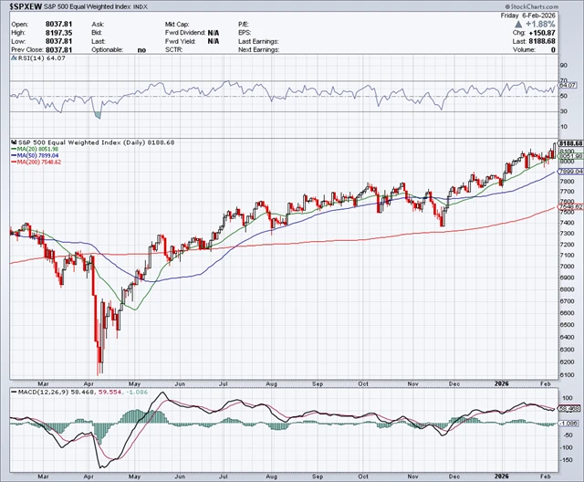 Uvidíme, jestli se slabost z technologického odvětví (největšího v indexu) výrazněji přelije do ostatních sektorů. Zaostávání technologických lídrů asi jen sotva zvládnou dlouhodobě vyvažovat defenzivní segmenty trhu (energetika, běžná spotřeba, případně zdravotní péče). Pohled na variantu indexu S&P 500, ve které mají všechny tituly stejnou váhu, ukazuje, že trh jako celek je na tom zatím dobře. Vlastně nejlépe v historii.