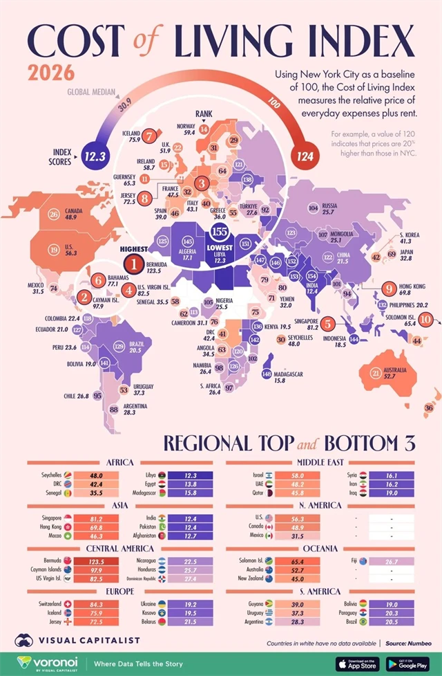 Vizualizace indexu životních nákladů pro rok 2026 založená na datech platformy Numbeo ukazuje výrazné rozdíly v cenových úrovních mezi jednotlivými zeměmi. Index porovnává ceny běžných výdajů včetně nájmů s New Yorkem, který slouží jako benchmark (100 bodů). Přestože inflace v mnoha regionech polevila, životní náklady zůstávají pro miliony lidí po celém světě zásadním problémem, ve 28 zemích vzrostly ceny bydlení od roku 2020 o více než 50 %, potraviny citelně zdražily například v Mexiku, Německu nebo Malajsii.