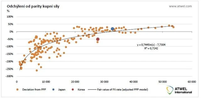 Namodelovali jsme tento vztah a použili historická data z cca 10 zemí celého světa v různých fázích ekonomického vývoje během posledních 15 let. Na grafu lze vidět odchýlení měnového kurzu korejského wonu a japonského jenu od dlouhodobě rovnovážných PPP hodnot.
