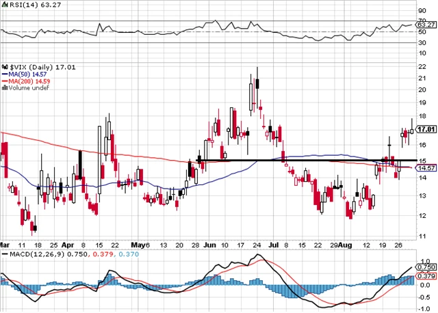 VIX v pondělí uzavřel na hladině 15 a při úterním propadu a nervozitě intradenně posílil až o 13 %. Za celý týden připsal 21%, je v rostoucím trendu, což je pro akcie negativní signál.