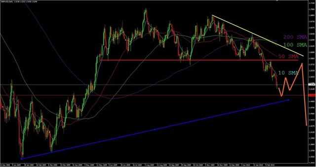GBP/USD zažívá výrazné, takřka každodenní výprodeje prakticky již od poloviny listopadu 2009. Na začátku února 2010 se GBP/USD konečně propadl z půlroční konsolidace v širokém, tisíci bodovém pásmu 1,58 až 1,68 a pod tlakem makroekonomických důvodů zamířil k jihu. Od začátku února ztratil GBP proti USD 4,45 % a od začátku roku 2010 již plných 5,61 %. Tento oslabující trend bude pravděpodobně ještě nějakou dobu pokračovat.