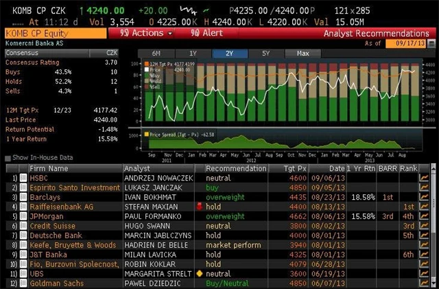 Začátkem září začali pokrývat akcie Komerční banky také analytici s HSBC s úvodním doporučením "neutral" a cílovou cenou 4 600 Kč. U Komerční banky postrádají výraznější faktory, které by cenu akcií ovlivňovaly, hodnotí valuace jako vysoké a zisky pod tlakem. V současnosti mají podle nich větší potenciál k růstu banky z Ruska než ze zemí střední Evropy.