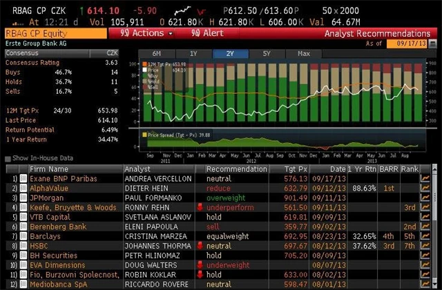 Akcie rakouské Erste stojí zhruba 24 eur, což je i průměrná cílová cena na trhu. "Výsledky Erste byly slabší, banka se nevyhnula poklesu úrokových výnosů. V tom se recese projevila na bance nejcitelněji a ve větším měřítku než u Komerční banky," domnívá se Luboš Bedrník z LBBW Bank.