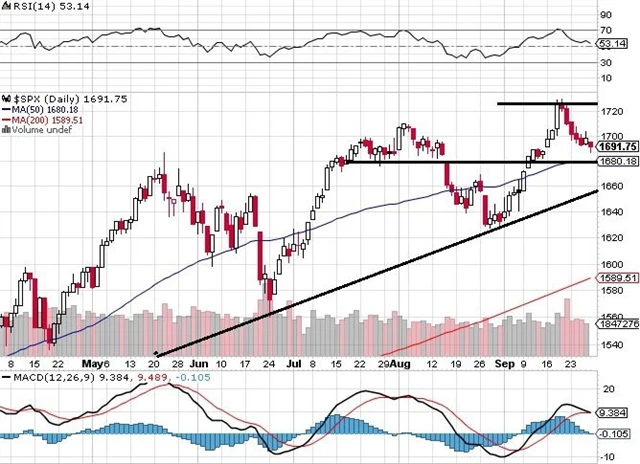 Index S&P 500 skončil týden se ztrátou 1,06 % a přiblížil se k hladině podpory v zóně 1 680 bodů. Další je pak na trendové čáře a na srpnových minimech okolo 1 630 bodů. Nejbližší rezistence je na historickém maximu 1 730 bodů.
