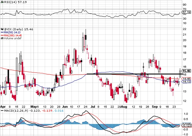 VIX se až do pátku držel pod hladinou 15, v pátek nakonec uzavřel výše. To je negativní signál pro akcie, je ovšem důsledkem politických hrátek.