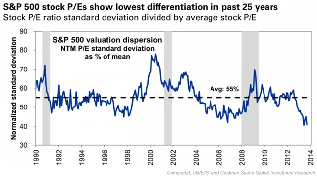 Hlavní akciový stratég Goldman Sachs David Kostin poukazuje na zajímavý úkaz na akciovém trhu v letošním roce. Rozptyl P/E valuací jednotlivých akcií klesl na minimum za více než 25 let. Akcie s různými fundamenty trh dnes, soudě podle valuací, hází všechny do stejného pytle. Jak to?