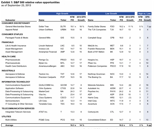 Výkon vysoce i nízce ohodnocených akcií se přibližuje. "Poptávka investorů po hodnotě je nesmírná," tvrdí Kostin. "Akcie s nízkými valuacemi předehnaly ty s vyššími o 12 % v roce 2013 na sektorově neutrální i vážené bázi."