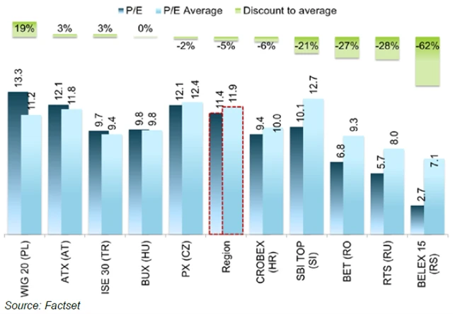 Současné ocenění vzhledem k dlouhodobému průměru ukazuje, že "drahé" jsou nyní akcie v Polsku a Rakousku, díky očekávanému růstu zisků jim ale analytici z Erste celkem věří i v dalším období.