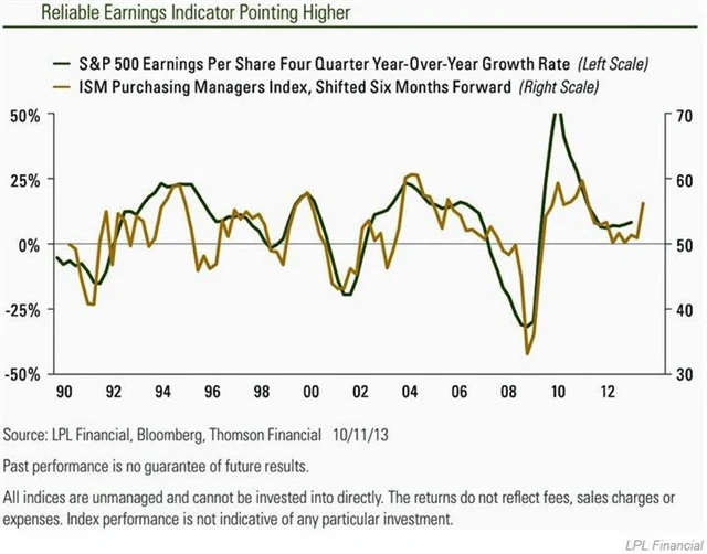 Poslední data naznačují, že se světové makroekonomické podmínky zlepšují, což by se mělo promítnout ve větší důvěře v budoucí růst zisků firem. Investory ostře sledovaný index ISM vcelku věrně předpovídá růst zisků v následných čtvrtletích. Indikátor naznačuje oživení z relativně slabé úrovně zisků a tržeb v minulých kvartálech.