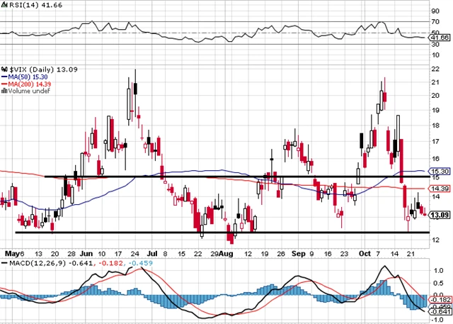 Index volatility VIX zůstává v dlouhodobém rozpětí 12 až 15. Zavírací ceny z posledních dvou pátků jsou 13,04 a 13,09. Signalizují, že obchodníci v nejbližší době neočekávají nebezpečí.
