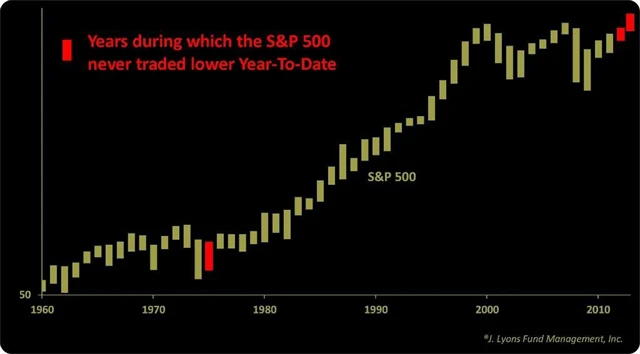 J. Lyons Fund Management upozorňuje na to, že se index S&P 500 v průběhu roku ani jednou nedostal do mínusu ve srovnání se závěrem roku 2012. To se od roku 1960 zatím stalo pouze dvakrát.