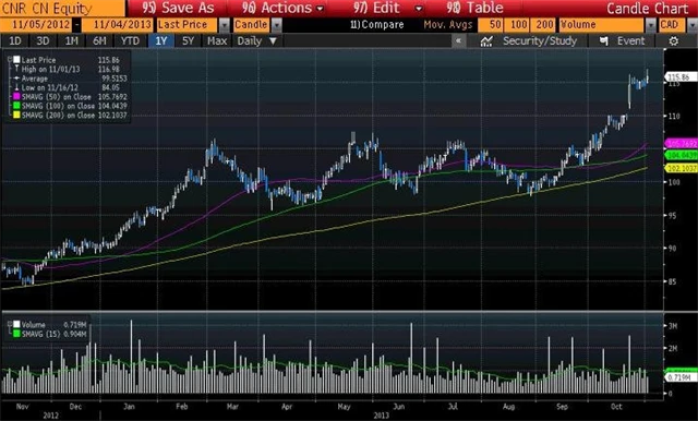 Největší kanadská železniční společnost přepravuje zákazníky v Kanadě, USA i Mexiku. Její akcie se v říjnu odrazily od čtyřnásobného vrcholu za vysokého objemu. Proražení vyústilo v rychlý růst ke 115 USD. Současnou cenu bude ale těžké udržet. Doporučit lze proto nákup na 107 USD s cílem na 125 USD.