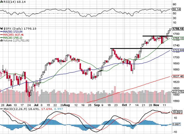 Index S&P 500 v uplynulém týdnu opět stanovoval nová historická maxima a posílil o 1,56 %. V pátek se cena zastavila na psychologické hladině 1 800 bodů.