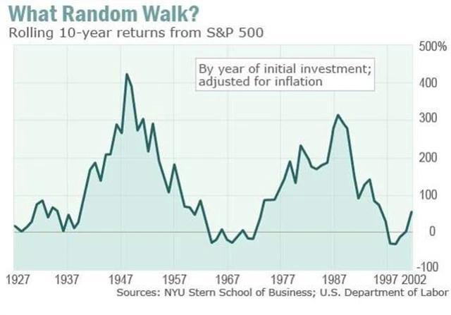 Graf jasně ukazuje, že výnosy z amerických akcií očištěné o inflaci v klouzavých 10letých obdobích kolísaly v obrovských vlnách. Poválečný boom nabídl mimořádně vysoké zisky, stejně jako investice mezi koncem 70. let a začátkem 90. let. V 30. letech nebo od roku 1963 do roku 1973 to ale bylo výrazně horší, mnohdy akcie nevydělávaly vůbec, a to ne pár let, ale v průměru celých 10 let. A to ještě investoři museli "vydržet" a neprodat akcie na úplném dně, když v roce 1929 ceny spadly o 90 %. Takže ani 10letý horizont při pasivní nebo pravidelně kumulované investici do amerických akcií negarantuje kladné zhodnocení.