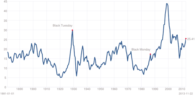 22. listopadu 2013 se Shillerovo P/E indexu S&P 500 dostalo na 25,41. Závěr si udělejte sami. Historický průměr, medián, nejvyšší a nejnižší historickou hodnotu ukazatele můžete sledovat ZDE. Ani tento tržní indikátor samozřejmě není perfektní – například v polovině 70. let mohl investory příliš brzy přimět investovat do akcií, v polovině 90. let na základě něj řada lidí mohla předčasně prodávat.