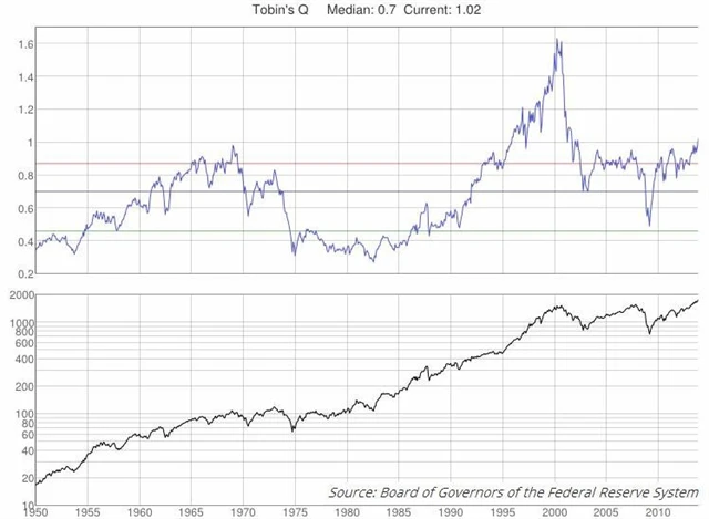 Historicky se q v průměru pohybuje mezi 0,6 a 0,7. To znamená, že hodnota všech akcií amerických firem by dokázala vyvážit 60 až 70 % veškerých aktiv těchto firem. V současnosti je q lehce nad 1, ceny akcií jsou tedy v souhrnu vyšší než celková aktiva firem. Opět si úsudek udělejte sami, q lze sledovat například ZDE.