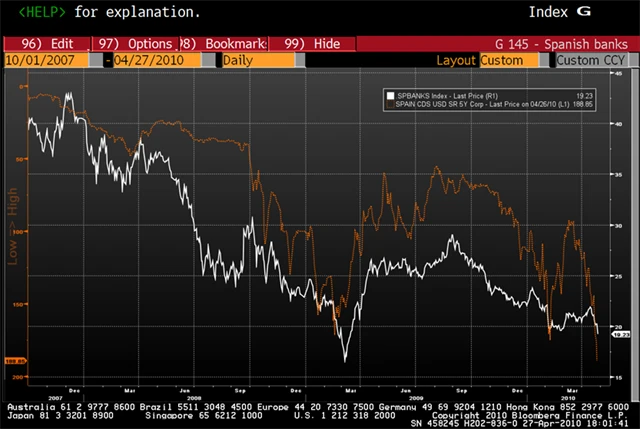 Investor získá velmi zajímavý obrázek, pokud se podívá na vztah 5letých CDS kontraktů na španělské vládní dluhopisy a koše čistě domácích bank (bez banky SAB, která může být "hard to borrow"). Pro ty, kteří věří v další rozšiřování spreadů mezi španělskými a německými dluhopisy, ovšem nemají přístup k těmto derivátům, výše popsaná investiční myšlenka může být vhodnou strategií.