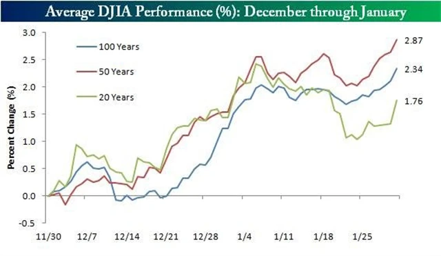 Dobře to vystihuje graf níže. Ten ukazuje, že v uplynulých 20, 50 i 100 letech jsou prosinec a leden v průměru pro akcie velice příznivé. Vývoj v uplynulých 20 letech je ovšem poněkud varující - akcie z indexu Dow v tomto období v průměru v lednu posílily jen o 0,03 %. Uvidíme, jaký bude start roku 2014.