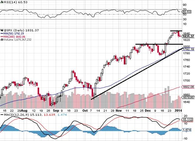Index S&P 500 zakončil rok 2013 tradičním růstem. Na druhou stranu ale první obchodní den roku 2014 přinesl poměrně netradičně pokles o 0,9 %. Situace na trhu je podobná jako před týdnem – dokud se index bude obchodovat nad 1 810 body, graf zůstane v býčím nastavení.