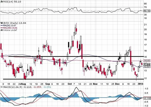 Index volatility VIX se od svých minim začal v pondělí vracet na vyšší hodnoty. Ve čtvrtek se přiblížil k 15, ale ze svého dlouhodobého rozpětí nevystoupil. V pátek uzavřel na 13,8 a pro akcie stále vysílá býčí signál.