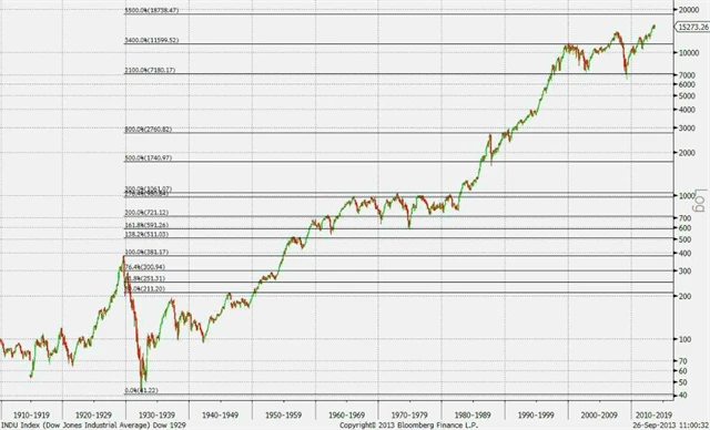 První – logaritmický – graf indexu Dow od roku 1900 ukazuje, jak se index choval, když dosáhl důležitých Fibonacciho úrovní podpory a rezistence v období od krachu v roce 1929 do roku 2010. Fibonacciho hodnoty jsou patrné vlevo.