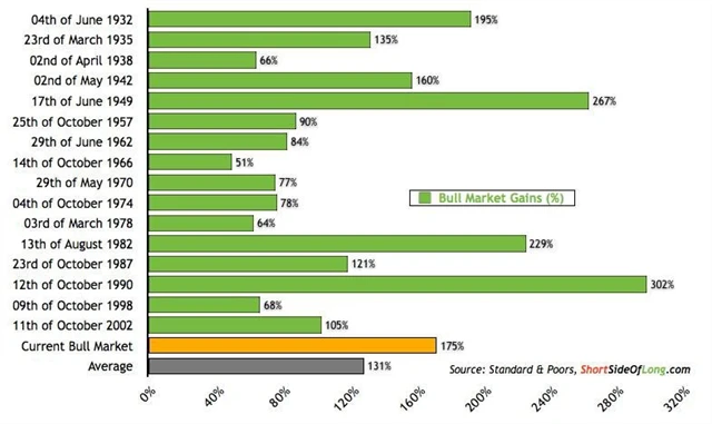 Když se podíváme na zhodnocení, současný býčí trh vyhnal americké akcie o 175 % výše. Jde o zotavení se z hlubokého propadu a o důsledek politiky centrálních bank, která nemá v historii obdoby.
