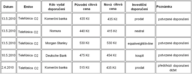"Po zklamání z kvartálních výsledků bychom mohli snížit náš celoroční výhled, zvláště pak pro český mobilní segment. Na druhou stranu management společnosti si je pro blízkou budoucnost jistý, když ponechává výhled OIBDA pro rok 2010 a podle výroků CEO firma plánuje i v příštím roce vyplácet dividendu 40 Kč na akcii. Se zbývajícím nerozděleným ziskem ve výši 5,7 Kč na akcii to znamená, že čistý zisk z českých operací nesmí letos spadnout o více než 11 %. Akcie po vydání našeho prodejního doporučení na počátku dubna pokračovaly v poklesu a ani nyní nevidíme v horizontu krátkého období žádný katalyzátor, který by tento trend mohl zvrátit," dodává Josef Němý z Komerční banky a potvrzuje stávající doporučení i cílovou cenu na úrovni 435 Kč.