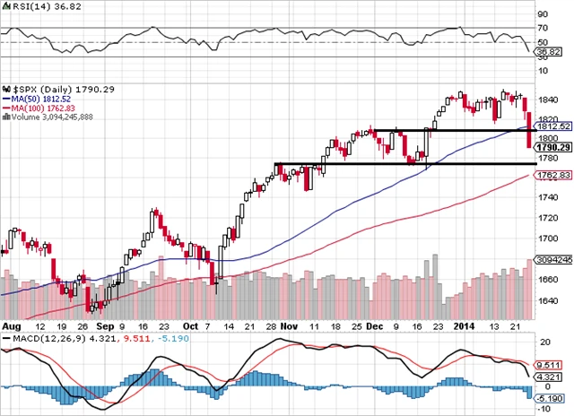 Pokles na trzích začal v Asii, pokračoval v Evropě a v USA uzavřel S&P 500 páteční seanci se ztrátou 2,09 %. Za celý zkrácený obchodní týden ztratil 2,63 %. Index prolomil důležitý support 1 810 až 1 800, 50denní klouzavý průměr a bez sebemenších problémů se přiblížil k silnému supportu v zóně 1 770 až 1 780. To vše při dvojnásobném objemu obchodů, než je tříměsíční průměr.