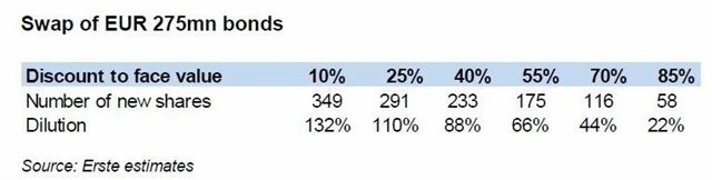Výměna dluhopisů v hodnotě 275 milionů EUR (obchodují se 15 % pod nominální hodnotou) by při současných cenách navýšila počet akcií o 22 %. Ušetřila by na úrokových nákladech 22 milionů EUR.