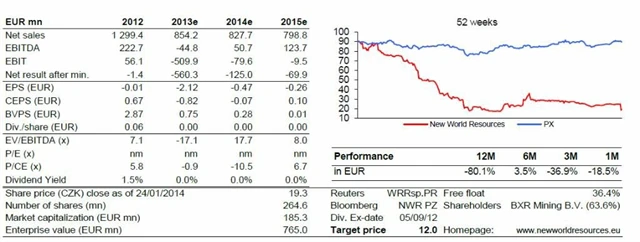 Ceny koksovatelného uhlí pro 1Q2014 klesly o 7 % na 91 EUR/t. "Při těchto cenách přijde NWR v roce 2014 o 130 milionů EUR. NWR bude mít zabezpečenou likviditu pro rok 2014, v prvním pololetí 2015 však už bude mít problémy s financováním," říká Bártek.