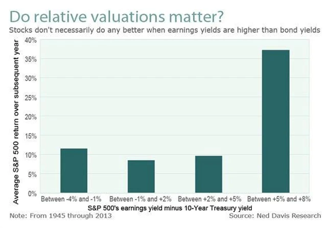 Vincent Deluard, stratég pro Evropu z Ned Davis Research, hledal podpůrné argumenty pro teorii relativních valuací. Spočítal pro každý rok od roku 1945 rozdíl mezi takzvaným "ziskovým výnosem" S&P 500 a výnosem 10letých státních dluhopisů. Ziskový výnos S&P 500 je převrácenou hodnotou P/E poměru, takže kdykoli P/E klesá, ziskový výnos roste. Na základě klouzavých 12měsíčních zisků je aktuálně ziskový výnos S&P 500 5,4 %, o 2,6 procentního bodu více než výnos 10letých státních dluhopisů.