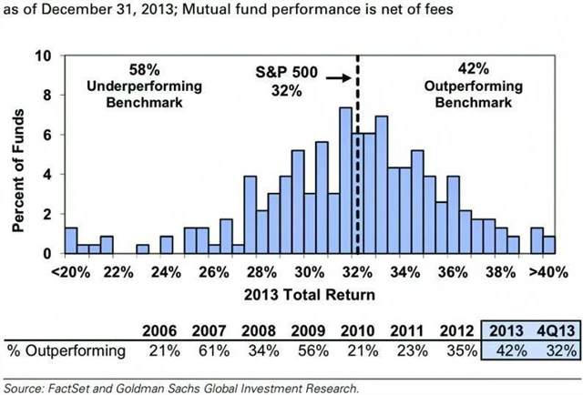 Ukažme si jeden velice nebezpečný graf. Jeho autorkou je Amanda Sneider z Goldman Sachs, která jej použila minulý týden ve zprávě s názvem Mutual Fundamentals. Ukazuje výkonnost 219 akciových podílových fondů zaměřených na large caps, tedy firmy s největší tržní kapitalizací. Tyto fondy mají ve správě přes 600 miliard USD. Vzorek nezahrnuje pasivně spravované indexové fondy.